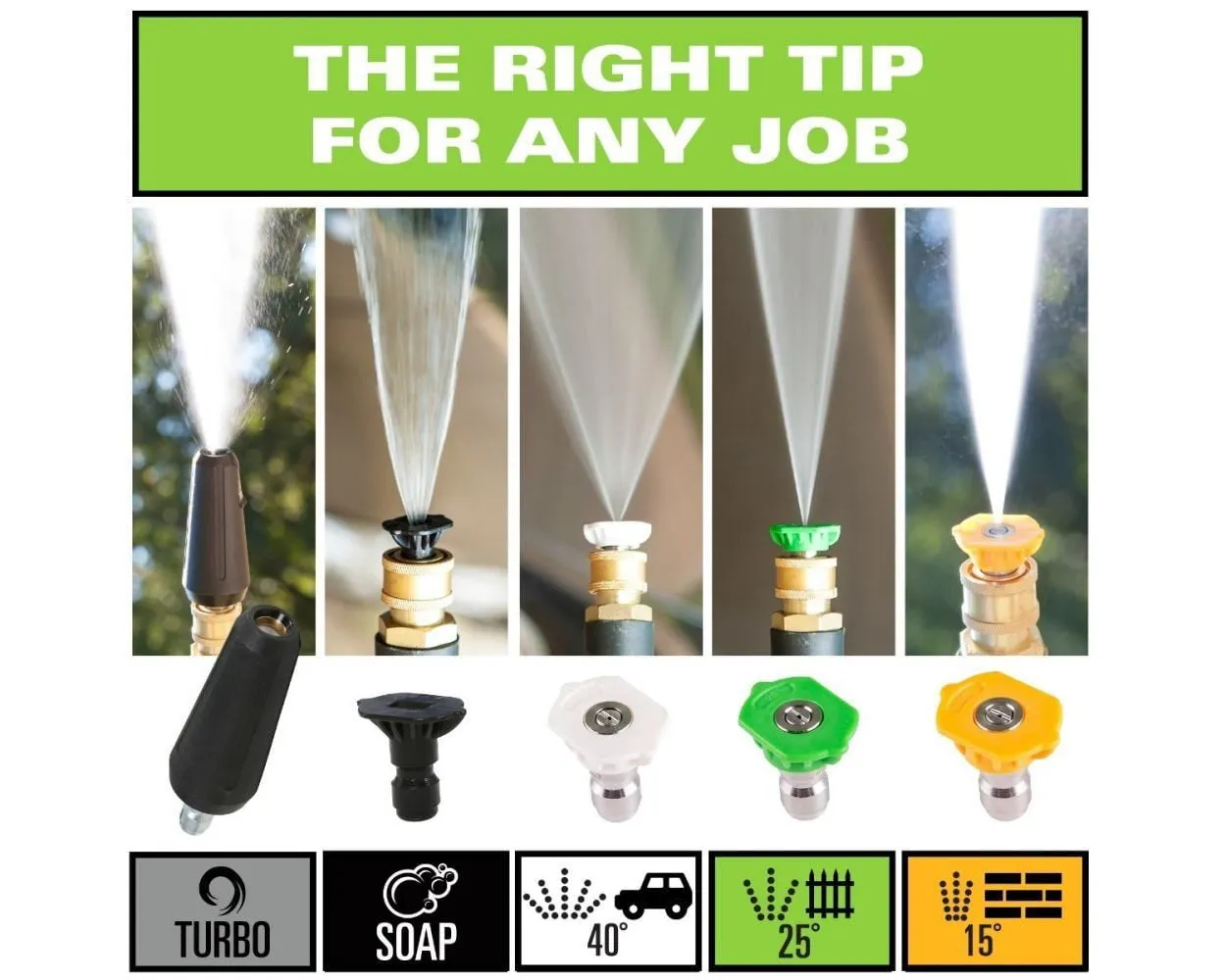 - Metal quick connect wand comes with 15° . 25° . 40° . soap . & turbo nozzle