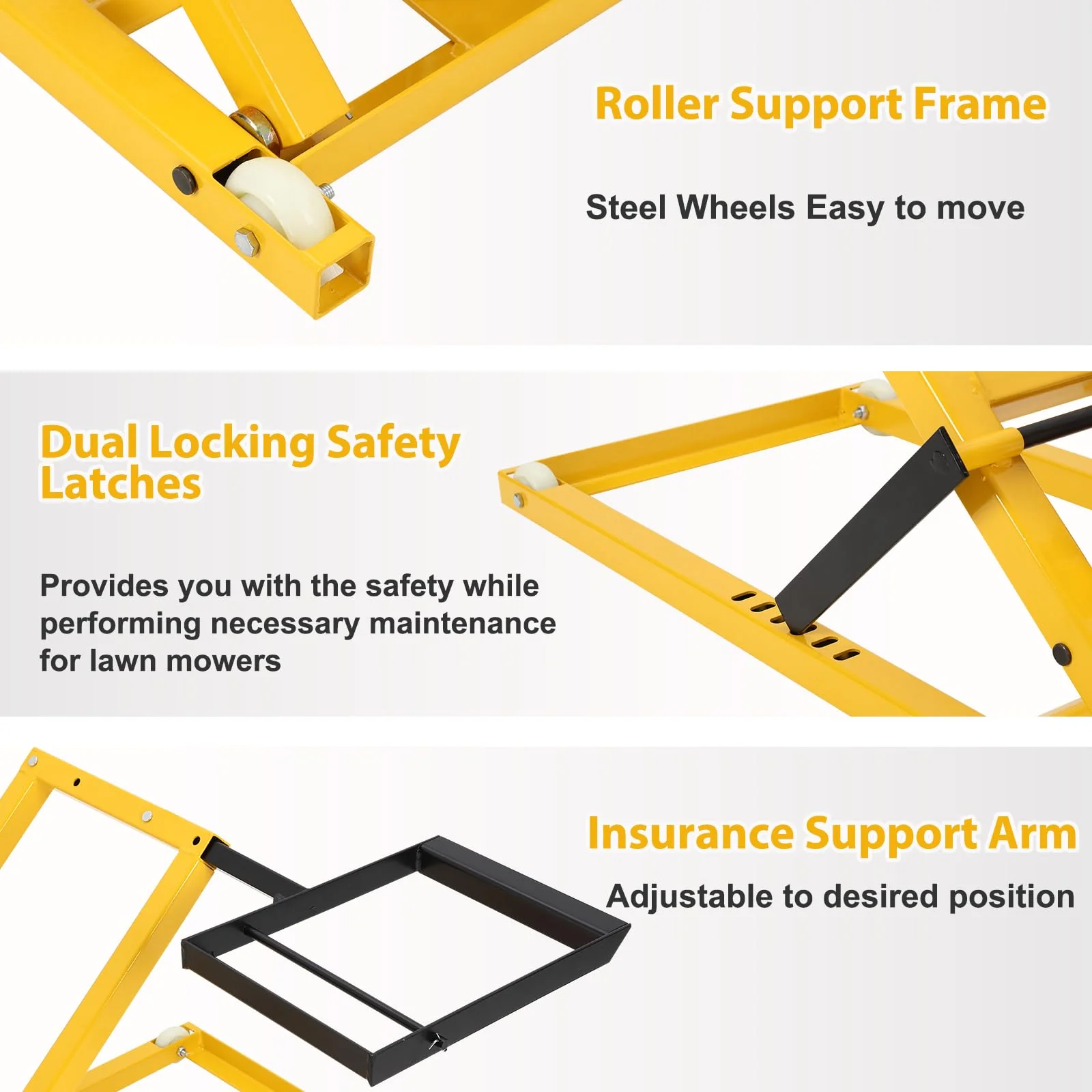 Provides strong support and durability for mowers when performing maintenance activities.Easily move and position the mower lift to secure the wheels to the bracket before lifting.
